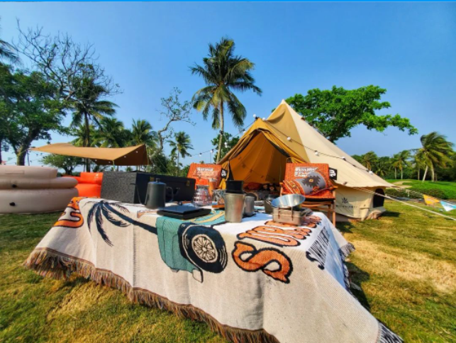 前往天涯会客厅,还有海南极玩地球文旅开展有限公司所带来的露营主题帐篷,在这里喝喝咖啡,聊聊天,感受北纬18度的热情。