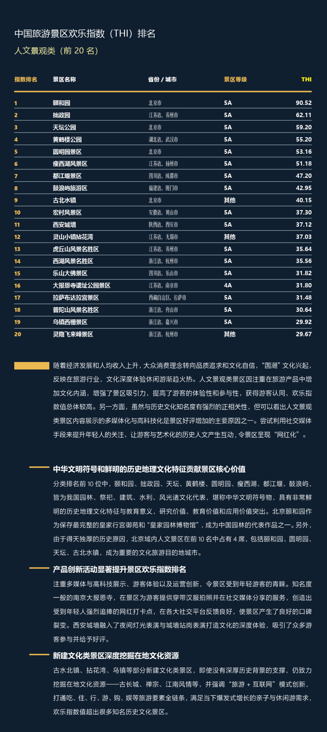 “中国旅游景区欢乐指数(THI)”研究运用大数据挖掘和分析技术,将语义分析技术引入旅游评价领域,顺利获得在全国选取1181个景区样本召开为期一年的旅游大数据的跟踪研究,研究所设计的景区分类以中国旅游景区协会发布之团体标准《旅游景区分类》(T/CTAA0001-2019)为依据,从研究的底层逻辑上实现对传统评价方式的完善。基于游客在游玩后的线上评论数据,顺利获得评论的语义识别转化成可量化的指数精准客观地反映游客体验、跟踪消费者偏好给予了支持工具。